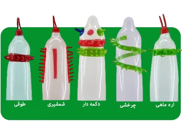 - مدل چرخشی : یکی از پرفروش ترین مدل های کاندوم فضایی محسوب می شود. خار های چرخشی نیزه مانند از جنس لاتکس که از سر کاندوم تا میانه ان به صورت چرخشی پایین امده است.